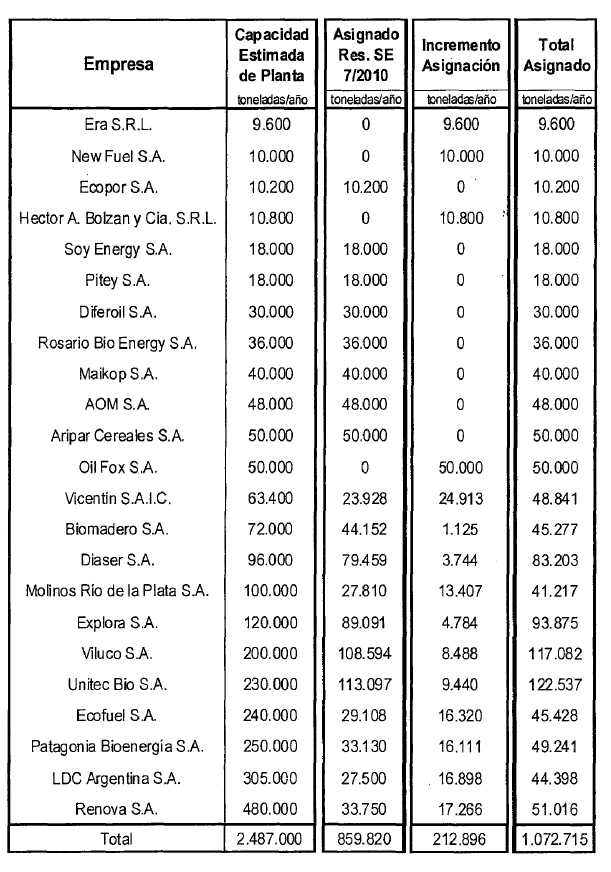 que, en conjunto, las empresas elaboradoras de Biodiesel poseen