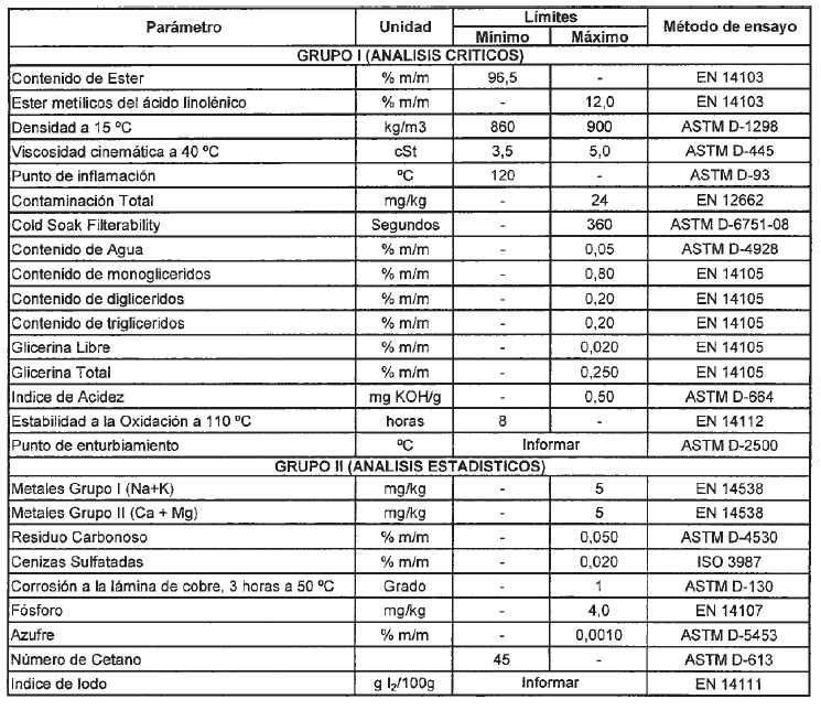 Calidad establecen las propiedades requeridas al BIODIESEL (B100) en el