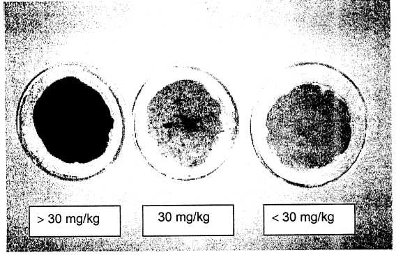 hierro no detectable, menos de 30 mg/kg., 30 mg/kg o más de 30 mg/kg de