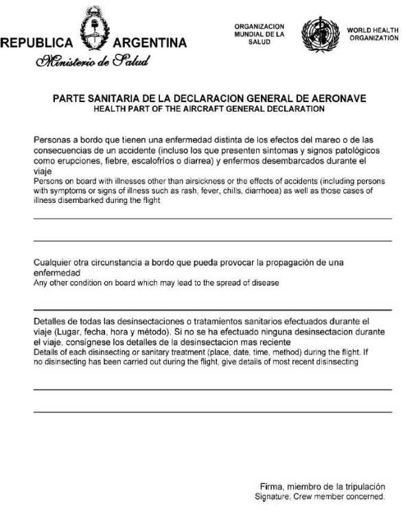 SANITARIO DE LA DECLARACION GENERAL DE AERONAVE, que como ANEXO IV forma