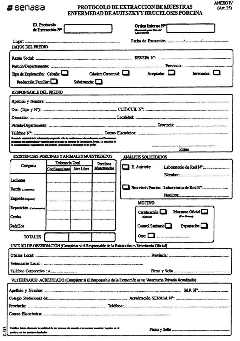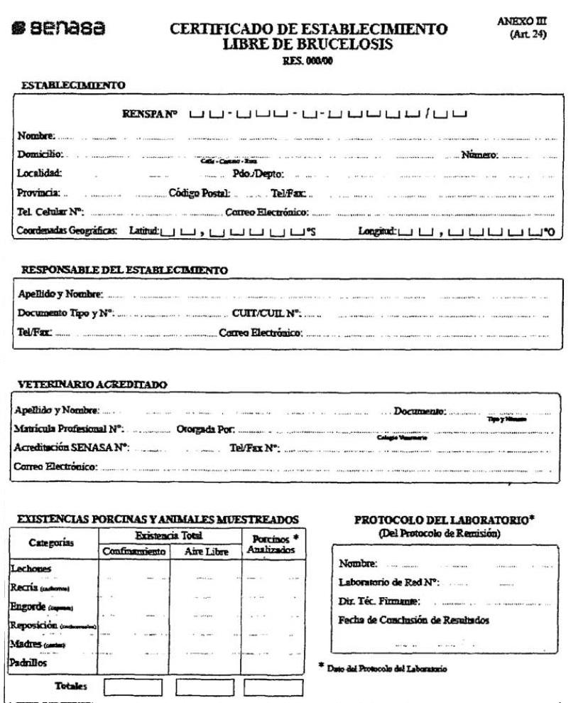 libres de dicha enfermedad. Que se debe enfatizar sobre la importancia que reviste en la producción de alimentos, la existencia de porcinos sanos desde su origen, facilitando de esta manera el control sanitario de la calidad total en la cadena de producción. Que el SERVICIO NACIONAL DE SANIDAD Y CALIDAD AGROALIMENTARIA, realizó un proceso de consulta pública. Que el presente acto ha sido propiciado por la Dirección Nacional de Sanidad Animal de este Organismo. Que la Dirección de Asuntos Jurídicos ha tomado la intervención que le compete, no encontrando reparos de índole legal que formular. Que el suscripto está facultado para el dictado del presente acto, de conformidad con las facultades conferidas por el Artículo 8°, inciso f) del Decreto Nº 1.585 del 19 de diciembre de 1996, sustituido por su similar Nº 825 del 10 de junio de 2010. Por ello, EL PRESIDENTE DEL SERVICIO NACIONAL DE SANIDAD Y CALIDAD AGROALIMENTARIA RESUELVE: Artículo 1° — Objetivo. Se aprueban los requisitos y procedimientos que deben cumplir los productores agropecuarios para que sus establecimientos obtengan la Certificación Oficial como Libre de Brucelosis Porcina y para incorporar sus rodeos al Registro Nacional de Establecimientos Oficialmente Libres de Brucelosis Porcina. Art. 2° — Registro Nacional de Establecimientos Oficialmente Libres de Brucelosis Porcina. Se crea el “Registro Nacional de Establecimientos Oficialmente Libres de Brucelosis Porcina”, cuyos alcances y condiciones se expresan en la presente normativa, quedando a cargo de su administración la Dirección Nacional de Sanidad Animal del SERVICIO NACIONAL DE SANIDAD Y CALIDAD AGROALIMENTARIA. Art. 3° — Establecimientos sujetos a la Certificación Oficial. Obligatoriedad. La certificación de Predio Libre de Brucelosis Porcina es obligatoria para la totalidad de los establecimientos inscriptos como cabañas —cuyos porcinos se encuentren o no inscriptos en los correspondientes registros genealógicos— y para los establecimientos proveedores de genética que deseen comercializar, ceder o permutar reproductores porcinos y/o material reproductivo porcino. Art. 4° — Reproductores con destino a venta, ferias, subastas o exposiciones. Todos los porcinos que se destinen a la venta para reproducción, ya sea en forma directa o que sean enviados a ferias, subastas o exposiciones deben provenir de predios certificados oficialmente como Libres de Brucelosis Porcina. Art. 5° — Registro Nacional de Establecimientos Oficialmente Libres de Brucelosis Porcina. Solicitud de Inscripción. La inscripción en el Registro Nacional de Establecimientos Oficialmente Libres de Brucelosis Porcina se solicita en la Oficina del SENASA que corresponda, presentando el formulario de “Inscripción de Establecimiento Oficialmente Libre de Brucelosis Porcina” que se aprueba en el Artículo 23 de la presente resolución, como así también cumpliendo con los requisitos para ingresar al Registro estipulados en el Artículo 6° de la misma. Art. 6° — Requisitos para inscribir un establecimiento en el