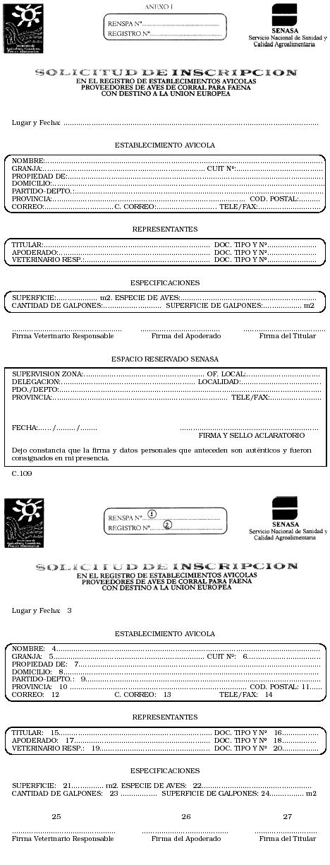 una Solicitud de Inscripción en la que se detallan las granjas avícolas