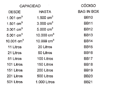 (Códigos, según su capacidad, del envase “Bag in Box” incorporados,