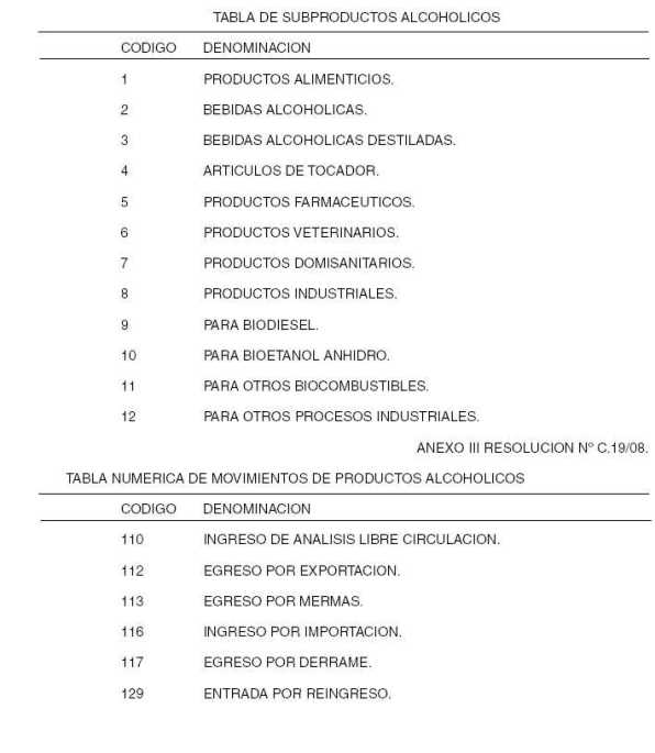 Oficial. Tabla de Códigos de Subproductos Alcohólicos. Tabla Numérica y