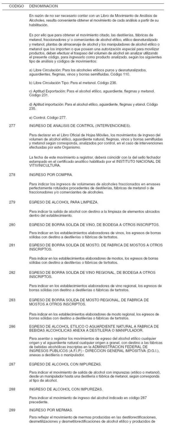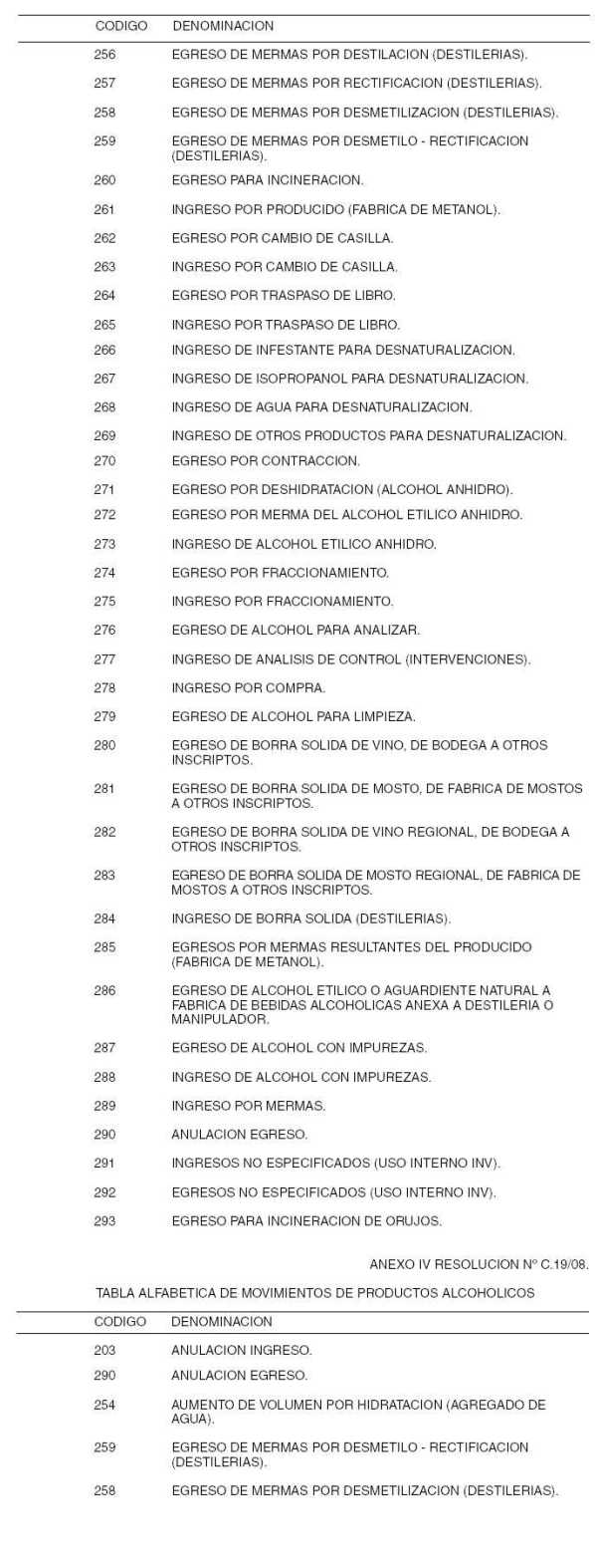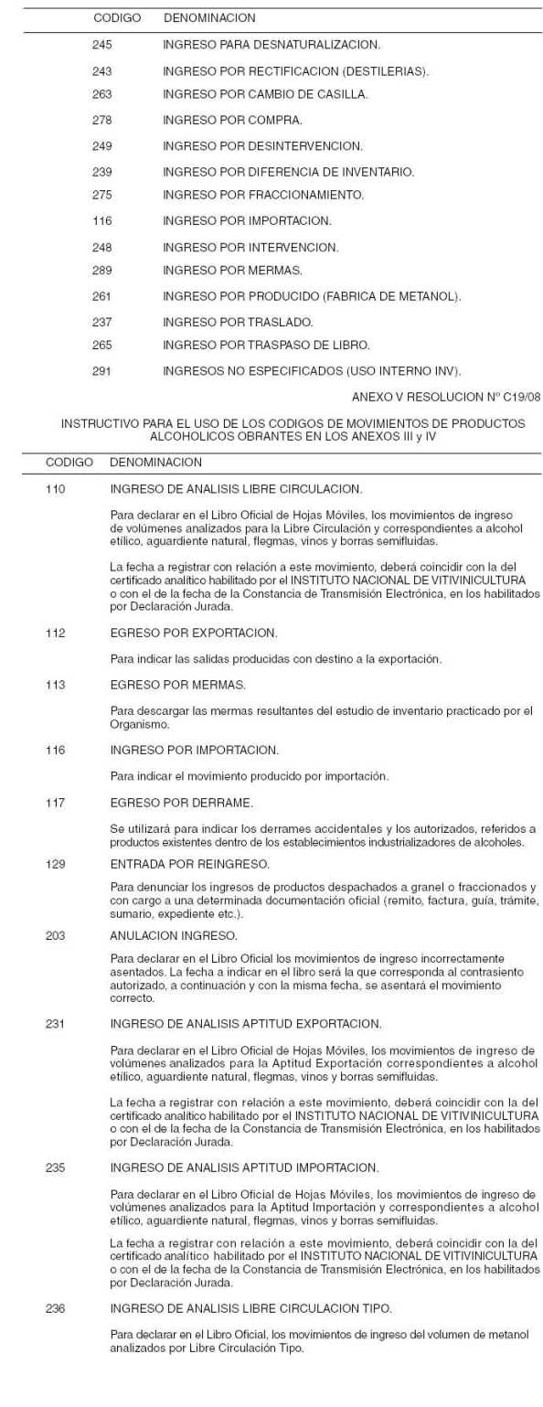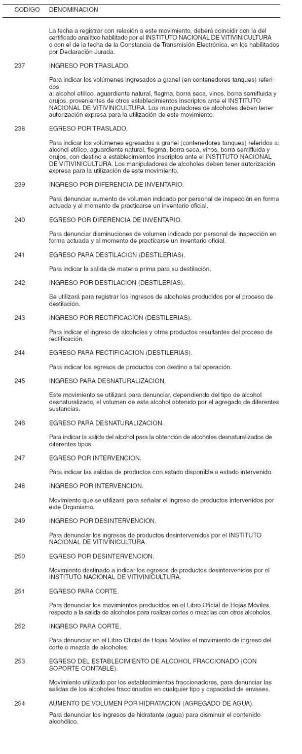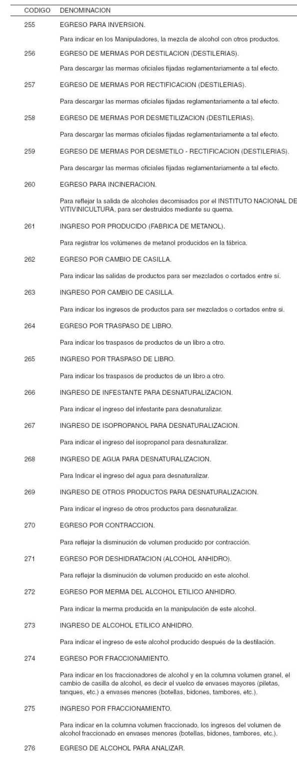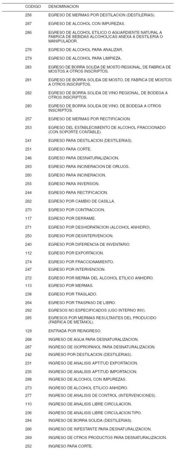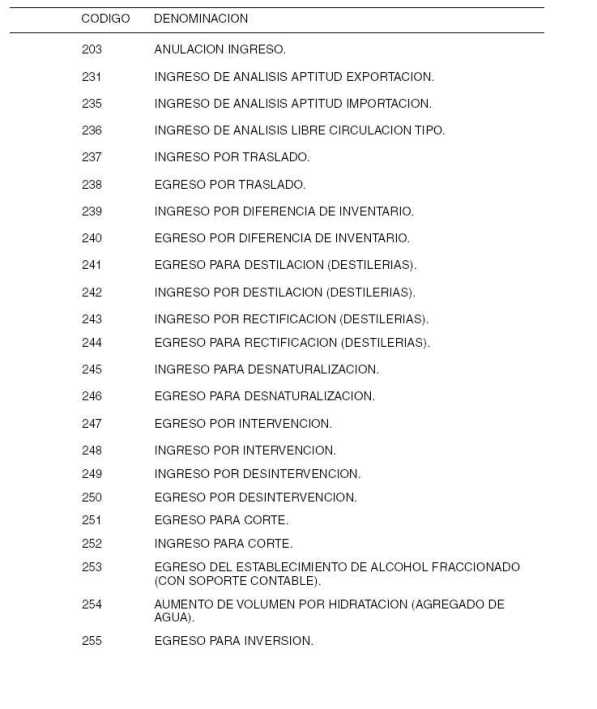 Uso de los Movimientos de Productos Alcohólicos. Tabla de Códigos de