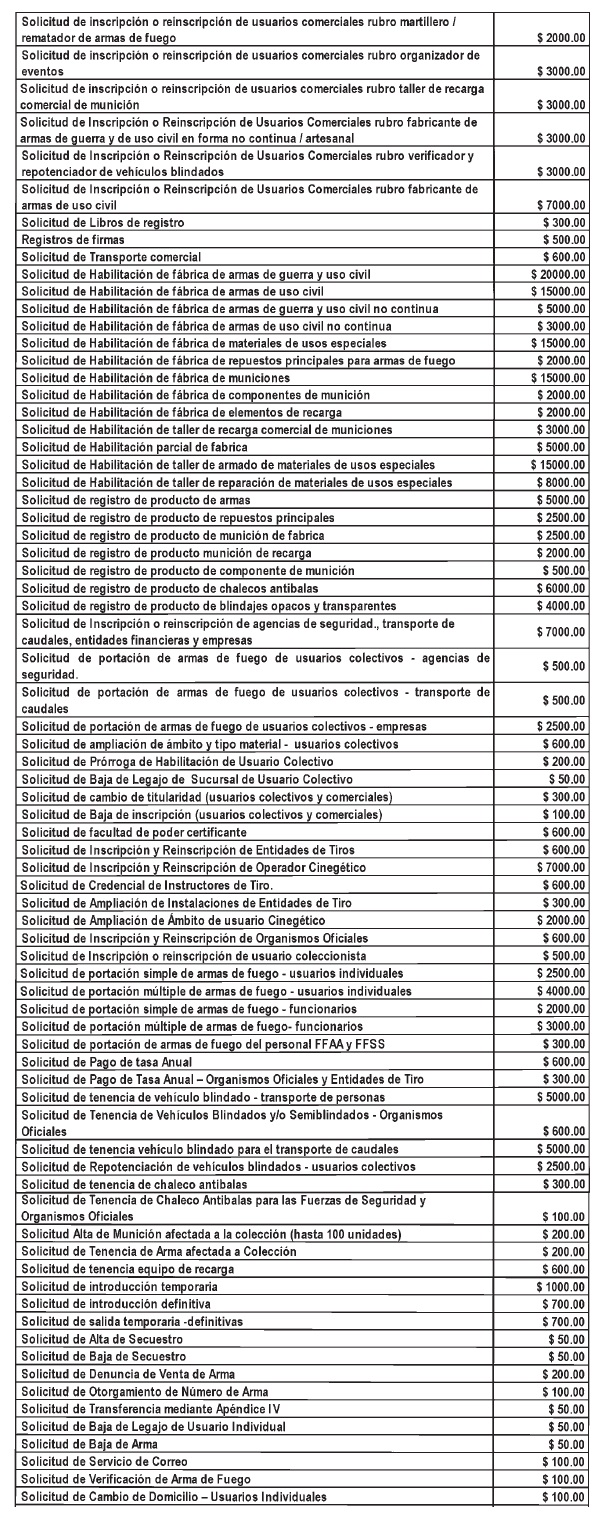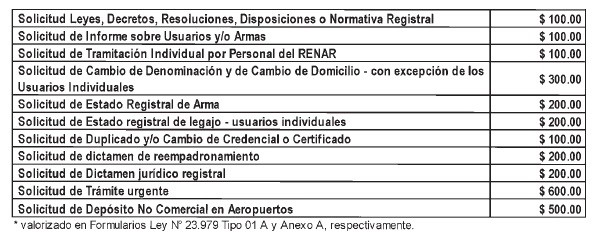 145 “El Registro Nacional de Armas (…) establecerán aranceles y tasas